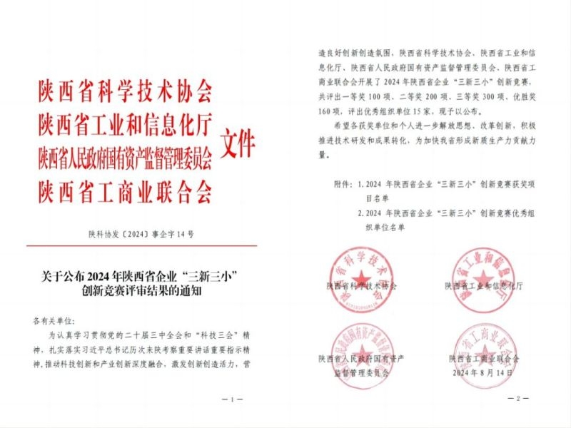 192024-08公司多個項目在2024年陜西省企業“三新三小”創新競賽中獲獎近日,由省科協、省工信廳、省國資委、省工商聯聯合舉辦的2024年陜西省企業“三新三小”創新競賽評審結果公布。公司所屬單位共10個項目獲獎,其中二等獎1項、三等獎4項、優勝獎5項。此項活動旨在推動科技創新和產業創新深度融合,激發企業創新創造活力,營造良好創新創造氛圍。...