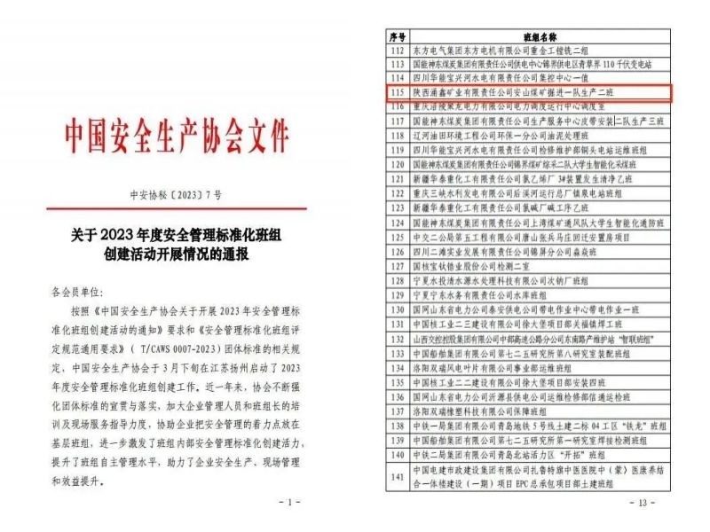 喜訊!中能袁大灘礦業綜采二隊生產一班入圍全國安全管理標準化二級班組