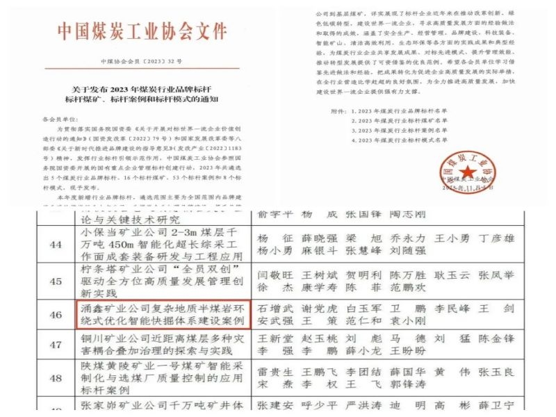 近日,中國(guó)煤炭工業(yè)協(xié)會(huì)印發(fā)了《關(guān)于發(fā)布2023年煤炭行業(yè)品牌標(biāo)桿、標(biāo)桿煤礦、標(biāo)桿案例和標(biāo)桿模式的通知》,涌鑫公司申報(bào)的《涌鑫礦業(yè)公司復(fù)雜地質(zhì)半煤巖環(huán)繞式優(yōu)化智能快掘體系建設(shè)案例》獲評(píng)“2023年煤炭行業(yè)標(biāo)桿案例”。近年來(lái),涌鑫公司結(jié)合工作實(shí)際和高質(zhì)量發(fā)展需要,以勇...