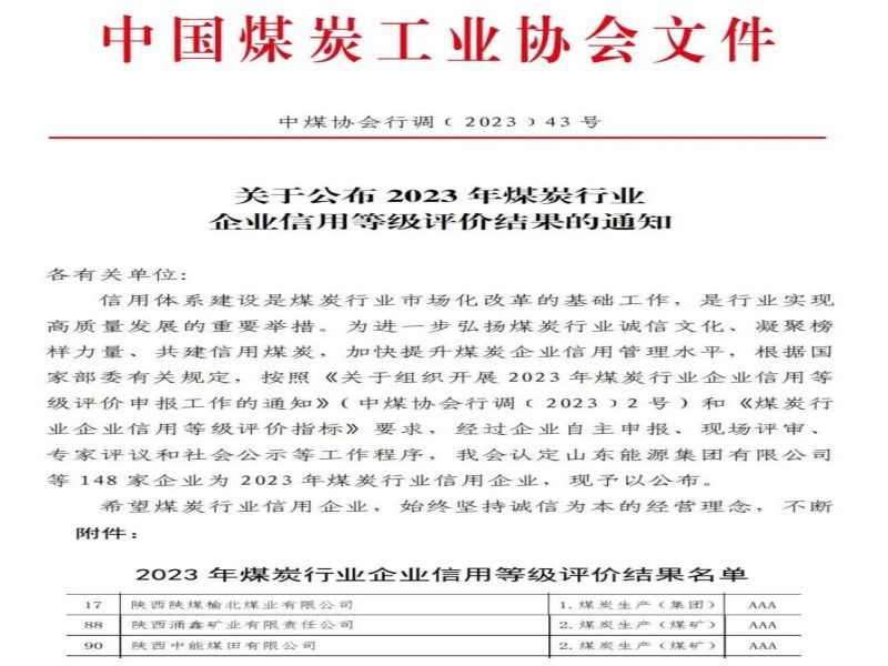 近日,中國煤炭工業協會印發了《關于公布2023年煤炭行業企業信用等級評價結果的通知》,公司獲評“2023年煤炭行業煤炭生產(集團)AAA級信用企業”榮譽稱號,涌鑫公司、中能公司獲評“2023年煤炭行業煤炭生產(煤礦)AAA級信用企業”榮譽稱號。近年來,公司高度重視企業信用體系...