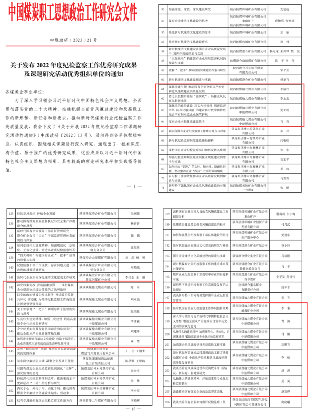 近日,中國煤炭政研會印發了《關于發布2022年度紀檢監察工作優秀研究成果及課題研究活動優秀組織單位的通知》,表彰了2022年度紀檢監察工作優秀研究成果和紀檢監察工作課題研究活動優秀組織單位。公司紀委報送的32篇紀檢監察工作研究成果中,19篇獲獎。其中《強化黨建引領推...