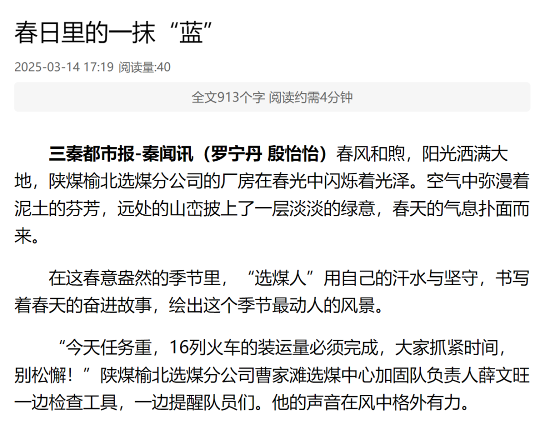 三秦都市報丨榆北選煤分公司:春日里的一抹“藍(lán)”