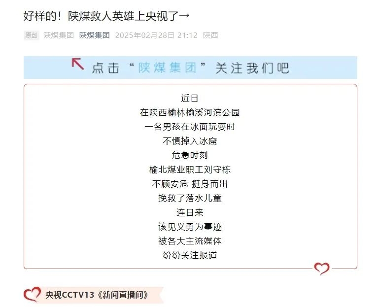 陜煤集團(tuán)微信丨好樣的!陜煤救人英雄上央視了→