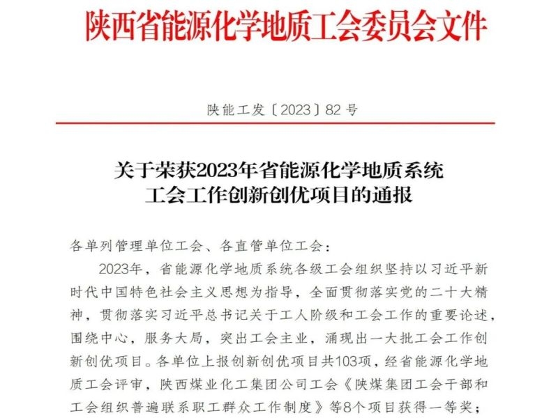 2023年陜西省能源化學地質工會工作創新創優項目公司獲獎