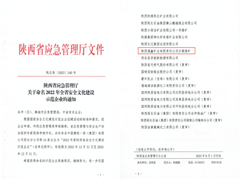 喜報(bào)!涌鑫公司沙梁煤礦獲評省級安全文化建設(shè)示范企業(yè)