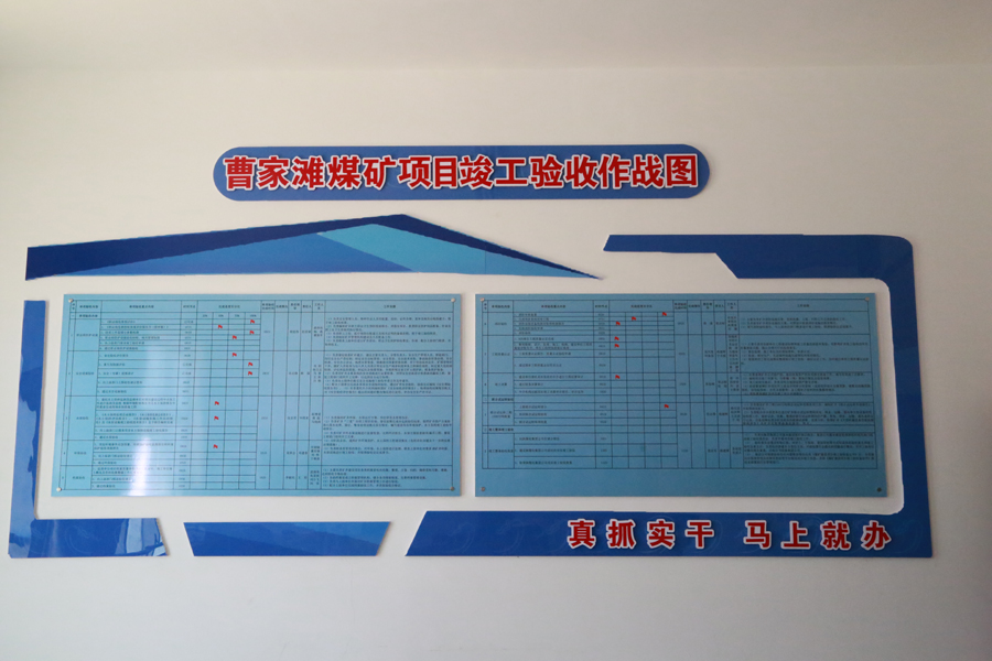 走進曹家灘項目驗收竣工辦公室,一幅紅藍搭配的《曹家灘煤礦項目竣工驗收作戰圖》便映入眼簾。走近一看,在作戰圖上詳細分布著十項內容:職業病防護設施、安全設施驗收、水保驗收、環保驗收、檔案驗收、消防驗收、工程質量認證、竣工結算、聯合試運轉驗收、竣工整體竣工驗收。每項單項內容由單項驗收內容、單項驗收重點內容、時間節點、完成進度百分比、單項驗收完成時間、完成情況、責任領導、責任人、工作人員、工作安排組成,通過采取橫豎交錯,數字相結合的形式,直觀地展示了公司項目竣工驗收各項工作進展情況。