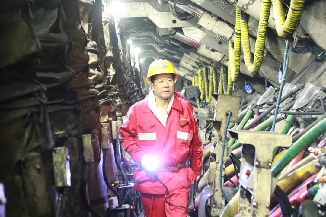 在曹家灘公司122108綜采工作面,石增武現(xiàn)場查看了工作面的生產(chǎn)檢修、地質(zhì)條件、設(shè)備運(yùn)行及安全管控和智能化建設(shè)工作。通過與現(xiàn)場工作人員交談,詳細(xì)了解了該工作面設(shè)備運(yùn)行、地質(zhì)結(jié)構(gòu)、勞動定員等工作情況。