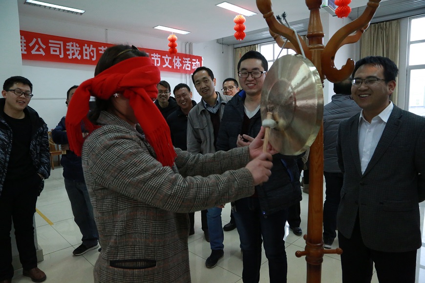 在瞎子敲鑼游戲中,大家爭先恐后地排在一起,只見敲鑼者蒙著雙眼,手持擊鼓棒,一步一步向前走去,這時,有“好心人”在一旁不斷的吆喝著:“向左走、向右走、往前走……”一名職工在他們的引領下,一棒擊下,因用力過猛,未擊中,一個釀蹌,引得在場的所有人捧腹大笑,卸掉圍巾,發現自己離銅鑼還有一米多遠,知道上當受騙,跑上前去與“好心人”追逐著、嬉戲著扭在一起。