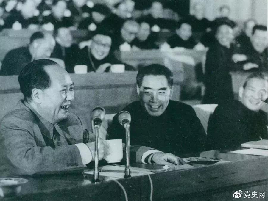 1962年初,毛澤東和周恩來、陳云在中共中央召開的擴大的中央工作會議(即七千人大會)上。