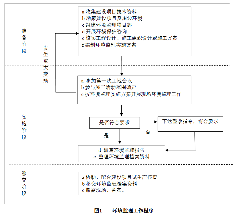 環境監理工作程序一般分為準備、實施、移交三個階段,工作程序見圖1。